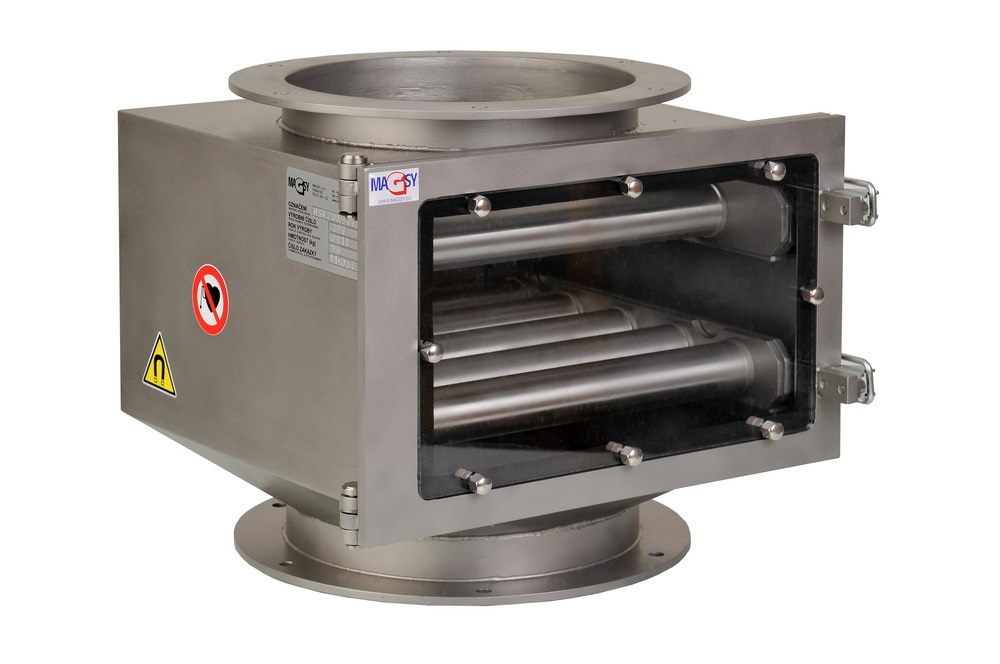 Les composants fondamentaux du séparateur magnétique sont des grilles magnétiques coulissantes qui ont été placées dans le capot de la structure en coffret. Le coffret du séparateur est installé sur le réseau de tuyauterie de la matière, si possible en position verticale et ce, à un endroit où le fluide friable tombe en chute libre. Les grilles magnétiques forment un champ magnétique dans lequel les particules et impuretés magnétiques sont induites et attirées vers la surface des tubes où elles s’accumulent et ce, principalement dans la partie basse du tube.Séparateur magnétique coulissant, placé dans une structure en coffret