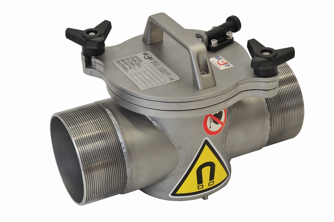Ce séparateur magnétique à débit pour citerne est utilisé pour séparer les impuretés métalliques qui se trouvent dans des matières en poudre sèches, friables et facilement pénétrables qui sont utilisées dans l’industrie alimentaire, dans l’industrie chimique ou dans l’industrie des matières premières et qui sont transportées dans des wagons-citernes et ce, lorsque le déchargement du mélange friable est réalisé en ayant recours à de l’air comprimé ou lorsque la matière s’écoule du wagon par gravité. La fixation de sécurité du composant magnétique au corps du séparateur est assurée à l’aide d’écrous de sécurité. Ce séparateur peut être installé sur un réseau de tuyauterie qui est sous une pression de maximum 2 bars. Le labyrinthe d’écoulement est formé de 7 tubes magnétiques.